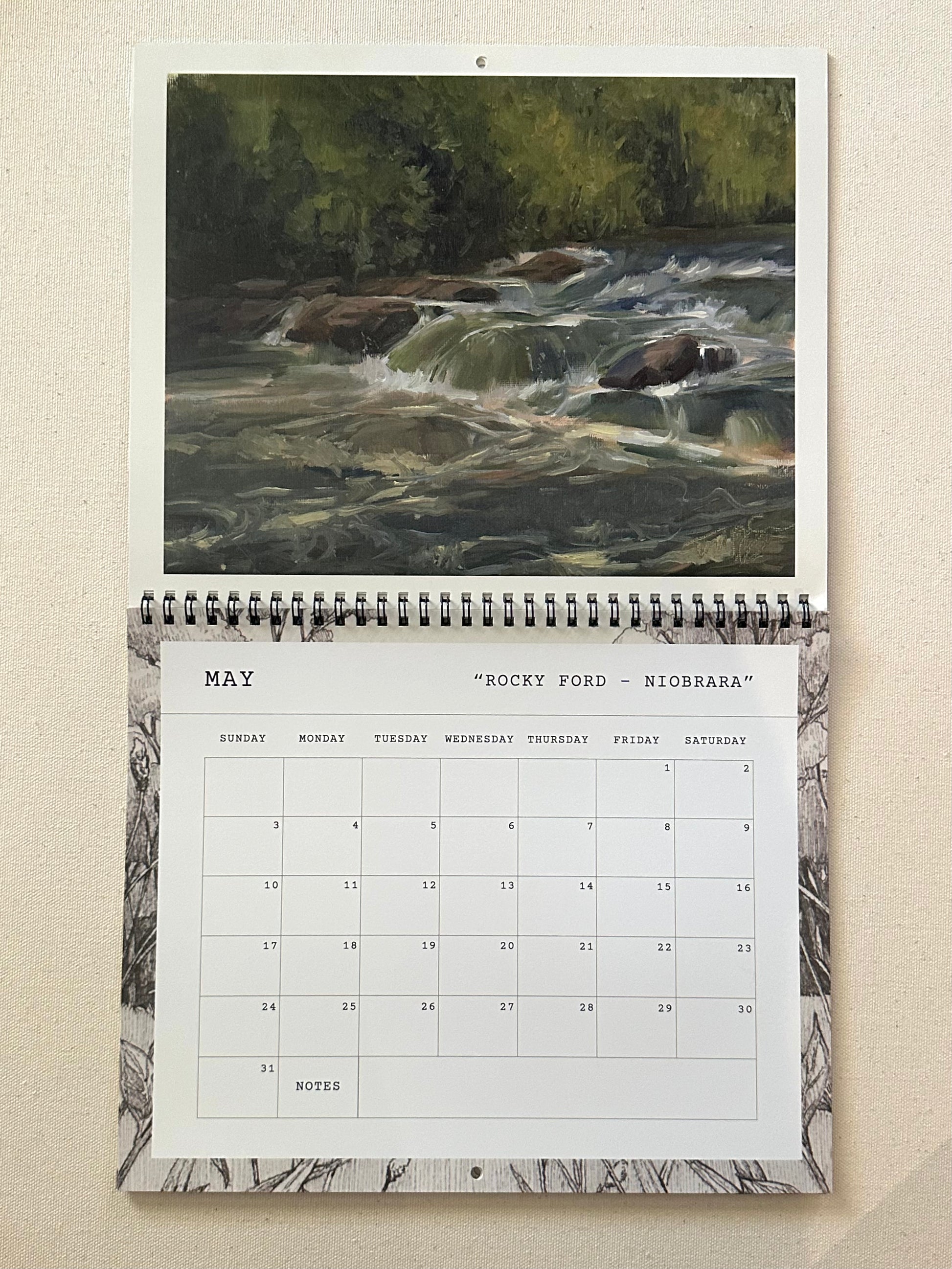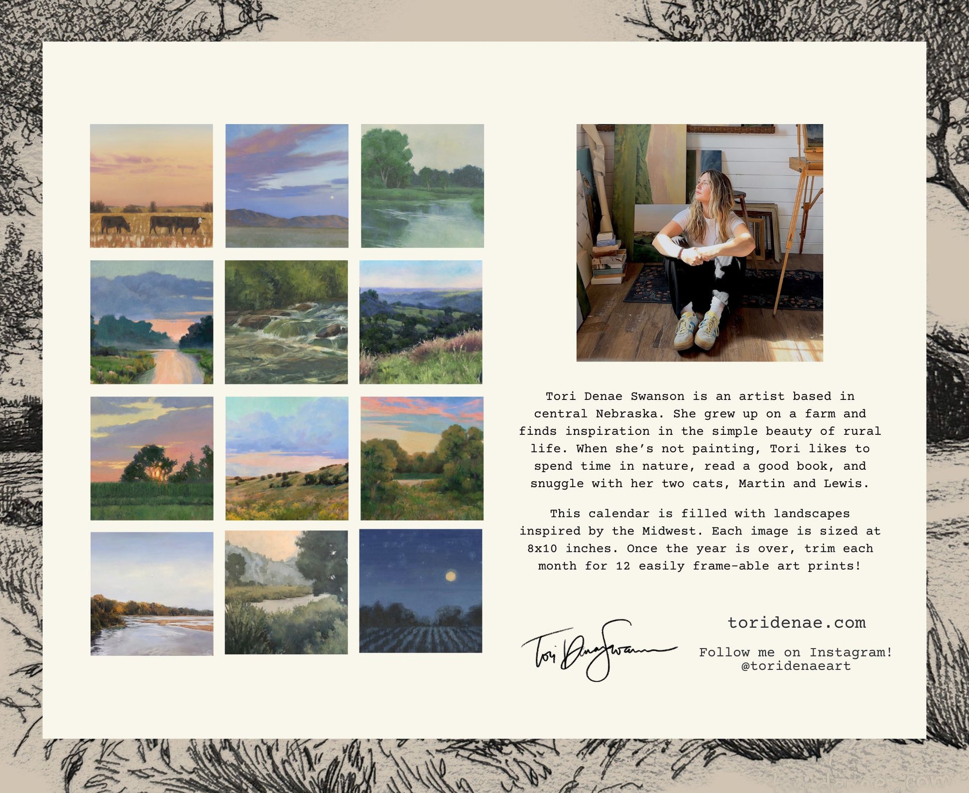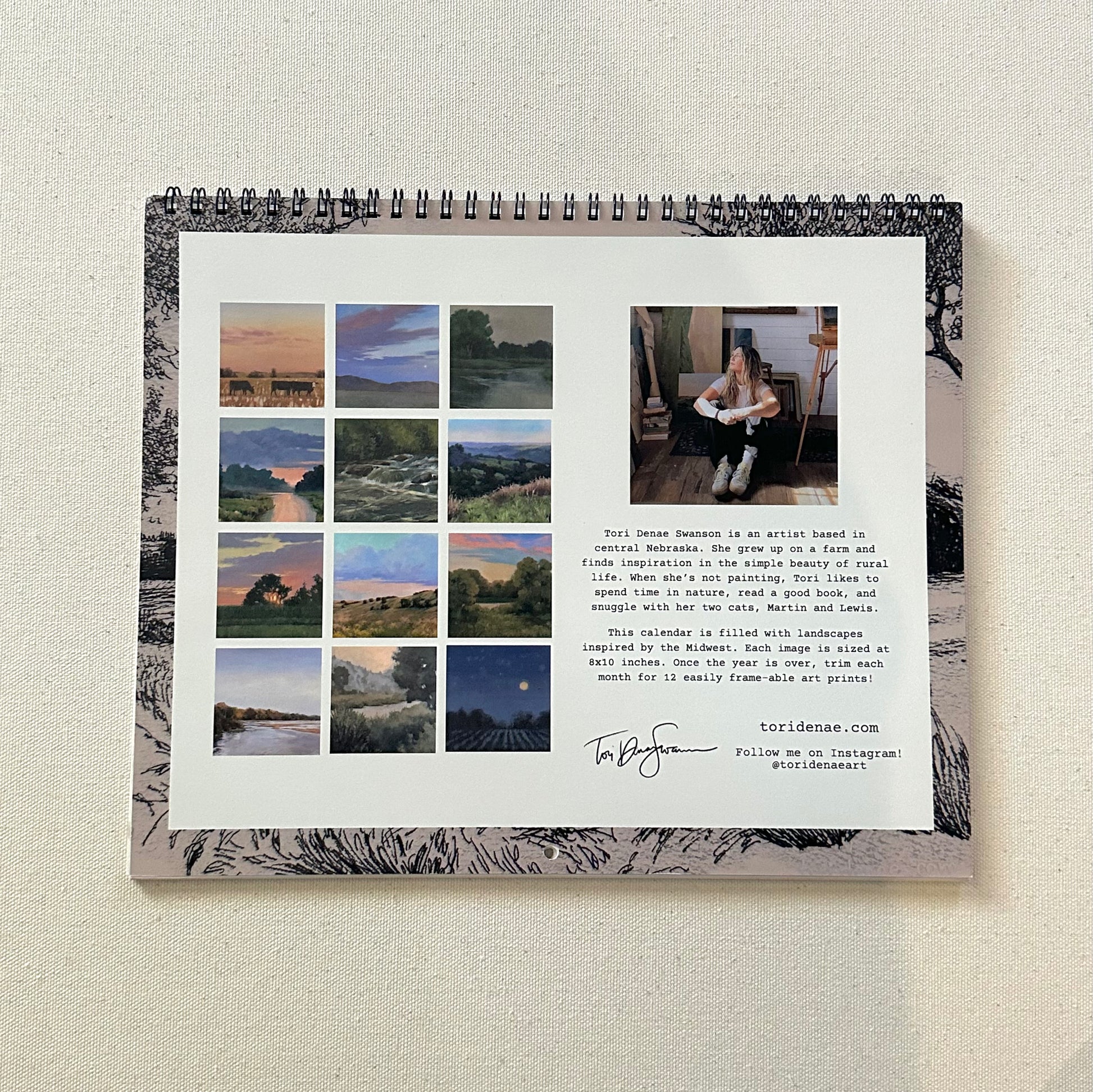 A 2026 calendar featuring a collection of my favorite landscapes I’ve painted this past year. Each image is sized at 8x10in, so once the year is done, you can trim them down into easily frame-able art prints! Wire-bound with a keyhole at the top for hanging. Calendar measures 11x9in folded, and approximately 22.5x9in open.