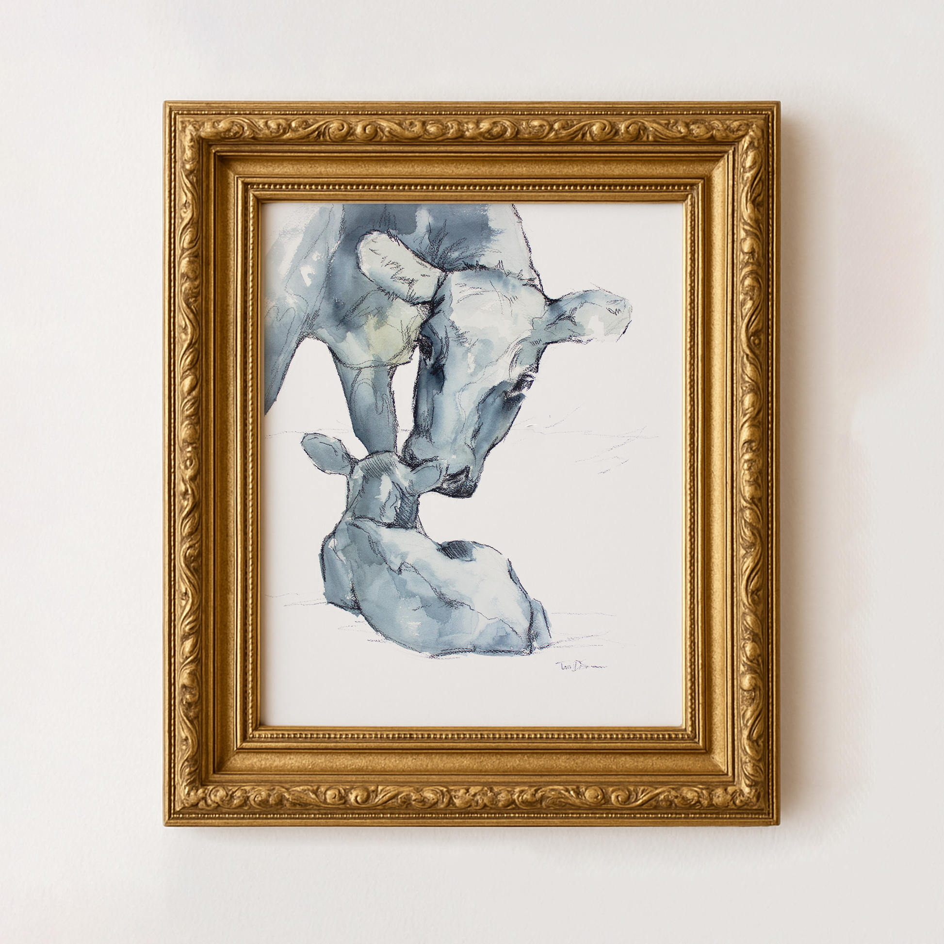 A fine art print of an illustration of a cow and calf in watercolor.
