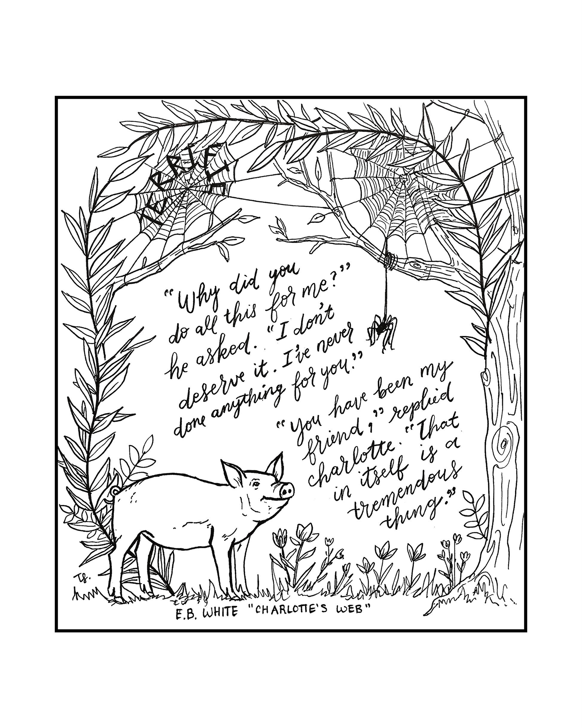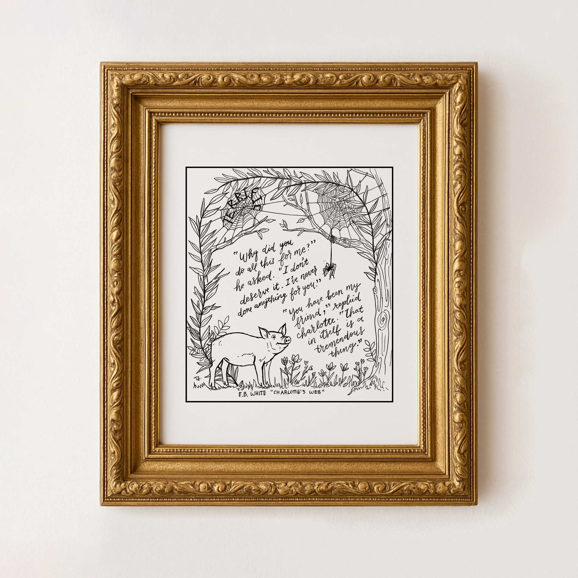 A fine art giclee print of an original ink illustration based on E.B. White's book, Charlotte's Web.