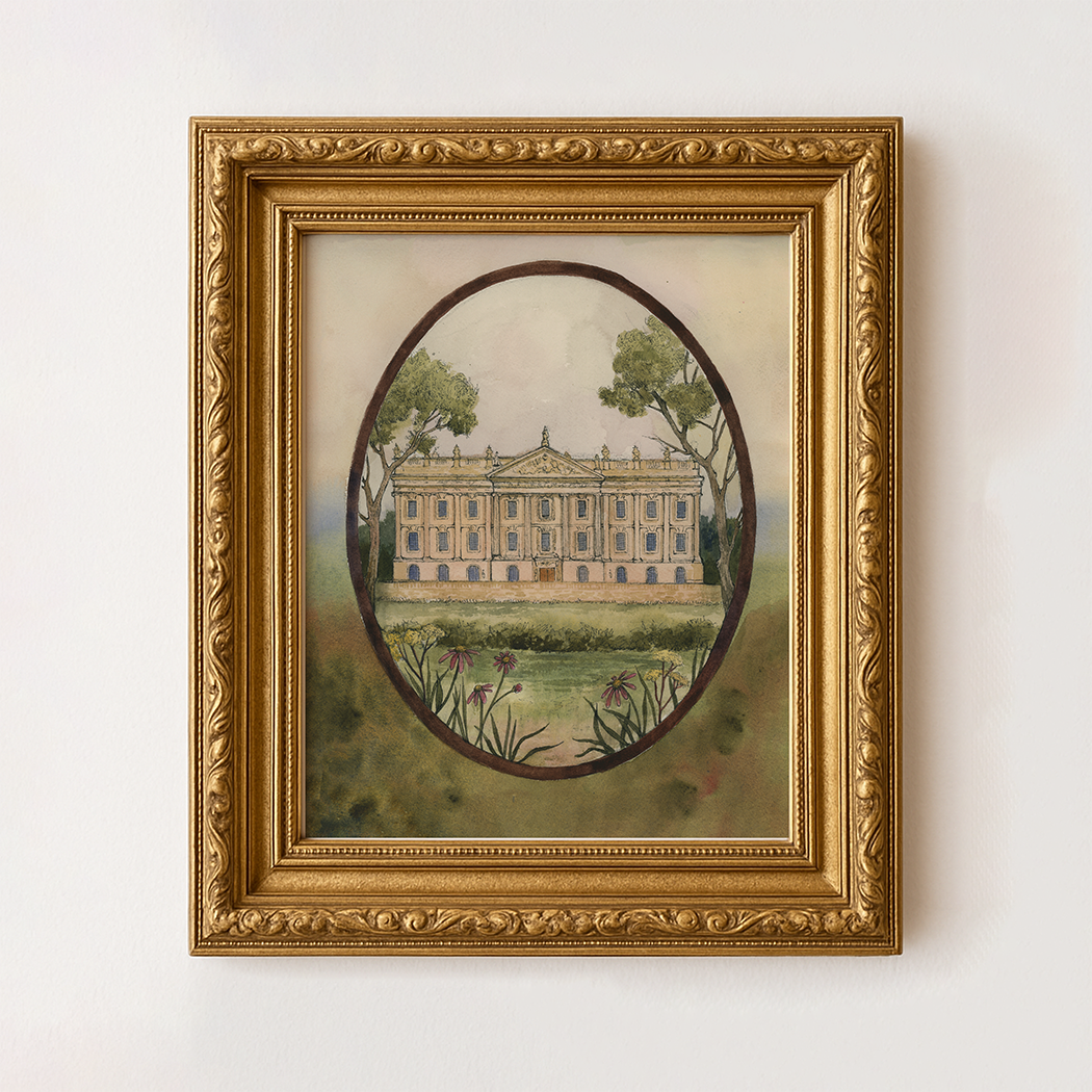 A fine art giclee print of an original watercolor and ink illustration of Pemberly from Pride and Prejudice 2005.