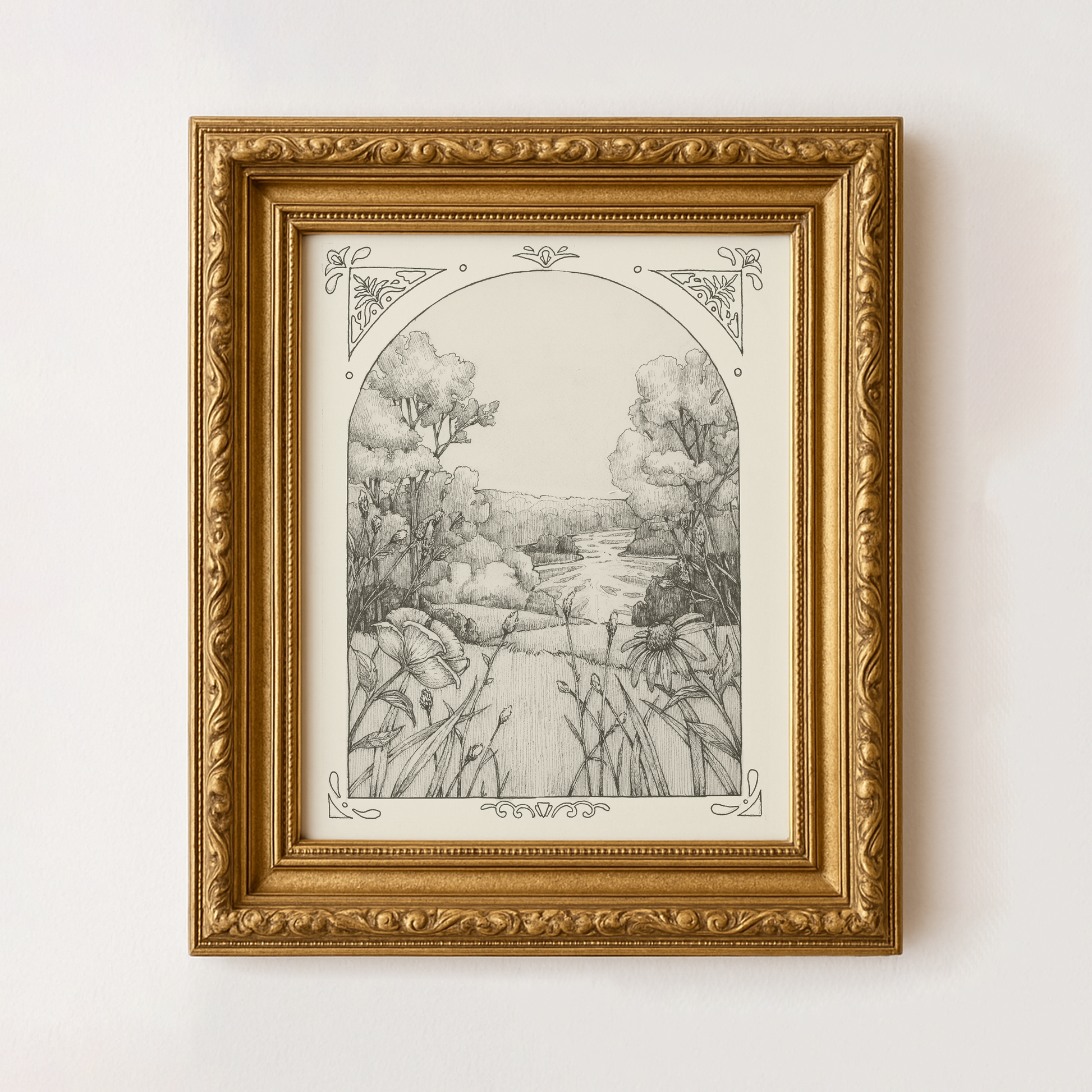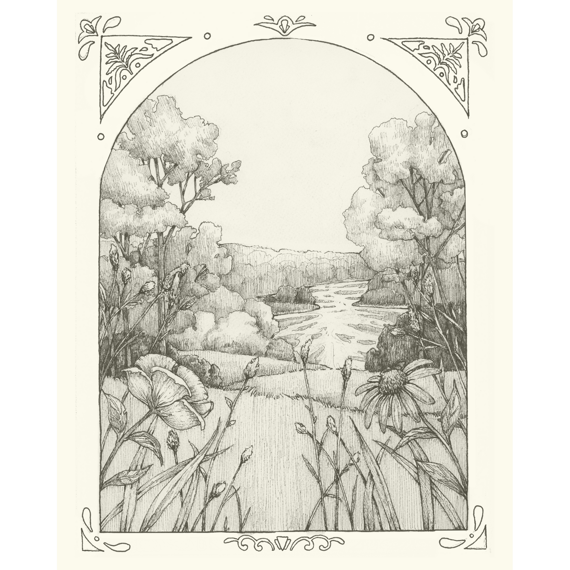 A fine art giclee print of an original illustration of prairie fields with the Platte River in the distance. This is loosely inspired by art nouveau illustrations from the late 1800s-early 1900s.