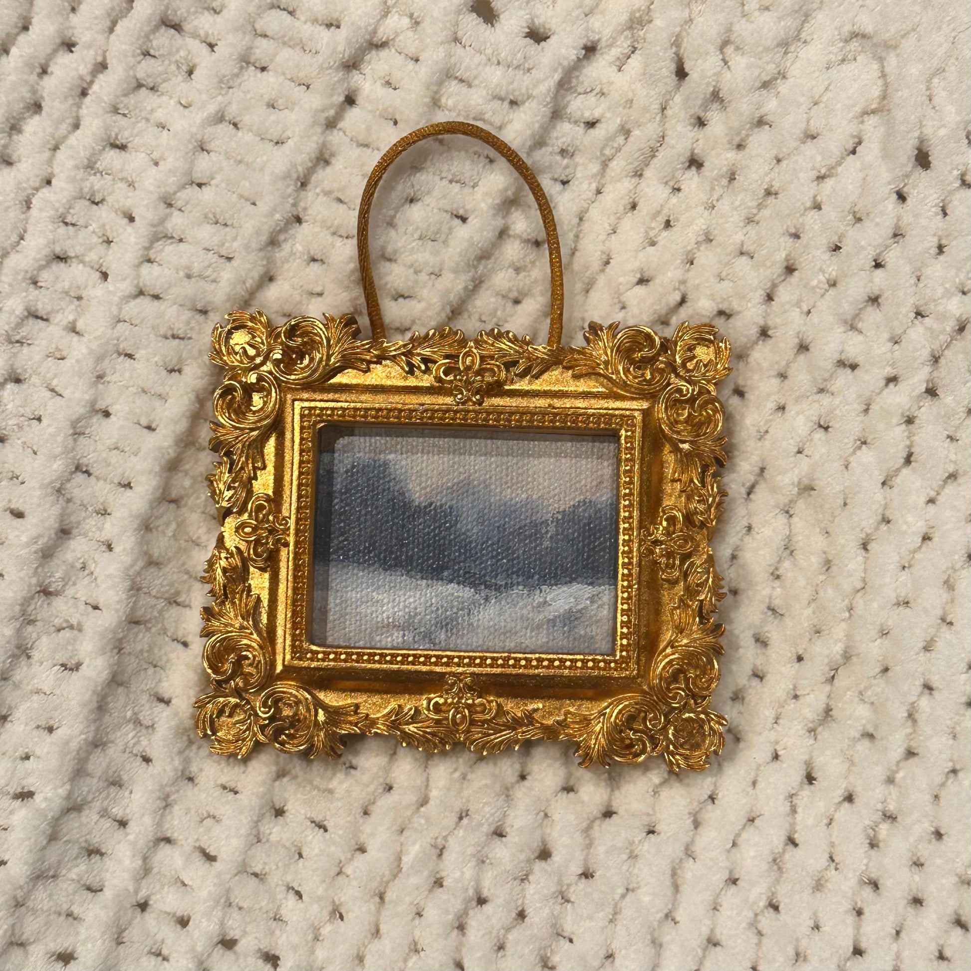 A hand painted ornament on canvas in a gold ornate resin frame, with ribbon glued on the back. Use as an ornament over Christmas, or hang year round in a mini gallery wall! Ornament is approximately 3.5x3in.